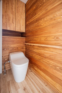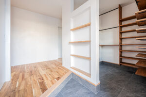 外観はガルバリウムとレッドシダーでかっこよく、内装は床や腰壁、吹抜けの天井に無垢木を使い温もりのあるお家に。